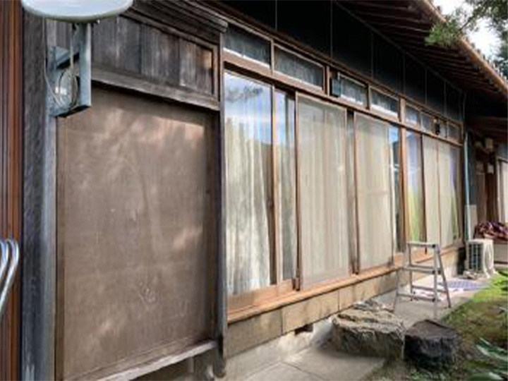 「木製の雨戸7枚中3枚が老朽化しているためどうにかしたい。使うのは台風のときだけなのでなるべく安価で工事したい。」というお客様からのご要望でした。